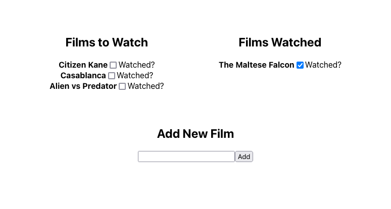 The example application built here shows two lists, one of films marked “To Watch” and another of films marked “Watched”. The interface then gives the user the ability to add new films and change film statuses.