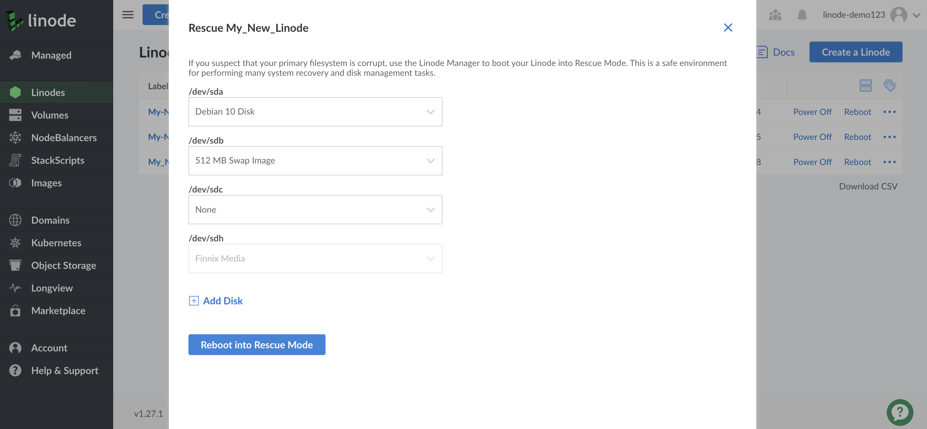 • You can boot your Linode into Rescue Mode to perform system recovery tasks and transfer data off the disks, if necessary.